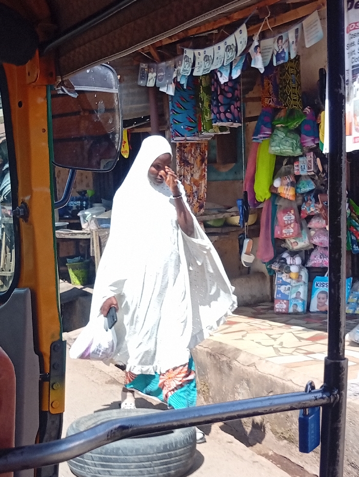 The image depicts an outdoor market or street scene in Jos, Nigeria, viewed from the interior of a yellow and green Keke Napep. In the immediate left foreground, a section of the tricycle's yellow frame and a rearview mirror are visible. A black tire lies flat on the paved ground in the lower-center foreground, partially obscured by a dark metal bar with a blue padlock on the lower right. A female individual is centrally positioned, walking from left to right. She is dressed in a white, full-length, abaya-style garment that covers her head and body, revealing a teal, orange, and white patterned wrapper or skirt underneath. Her right hand is raised to her upper face/chin area, while her left hand carries a dark smartphone and a white plastic bag. She is wearing white sandals. Behind the individual is an open-front market stall with a wooden frame structure. Various patterned fabrics are displayed, hanging from the frame. Below these, multiple small plastic bags containing consumer goods are visible, hanging on the right side of the stall. Along the top of the stall, several decorative banners, some resembling stylized currency notes and others depicting faces, are strung horizontally. The ground in front of the stall is concrete, with sections of patterned tile. The scene is brightly illuminated by direct sunlight, casting distinct shadows.