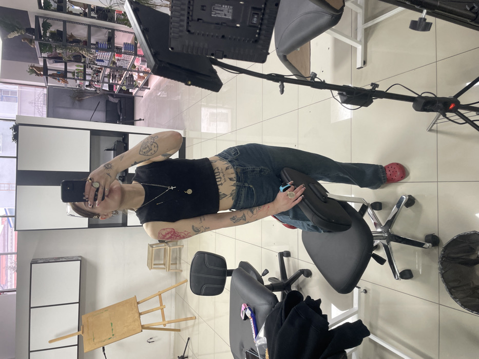 The image depicts an individual taking a mirror selfie inside a tattoo studio located in Rostov-on-Don, Russia. The subject, appearing young, stands centrally in the frame, wearing a black sleeveless crop top, blue denim jeans, and red Crocs. Their right hand holds a black smartphone, angled upwards to capture the reflection, which partially obscures their lower face. Extensive tattoos are visible on both arms, including a prominent red jellyfish-like design on the left upper arm, and script text on the abdomen. Multiple rings are present on the fingers, and a silver-colored chain with a cross pendant and a circular pendant is worn around the neck. The studio environment features white tiled flooring and light-colored walls. To the left, a wooden artist's easel with a blank board and a small two-step wooden stool are visible. In the mid-ground, two black rolling tattoo chairs with chrome bases are present; one holds a dark hoodie and a wrapped snack item (chocolate bar), while the subject's right leg rests on the padded backrest of the other. A tall black light stand with an attached LED panel is positioned to the right of the subject. The background, visible through the mirror's reflection, includes a metal shelving unit stocked with numerous bottles, potted plants, and various supplies, alongside a dark sofa and an exterior view through a window revealing an urban building.