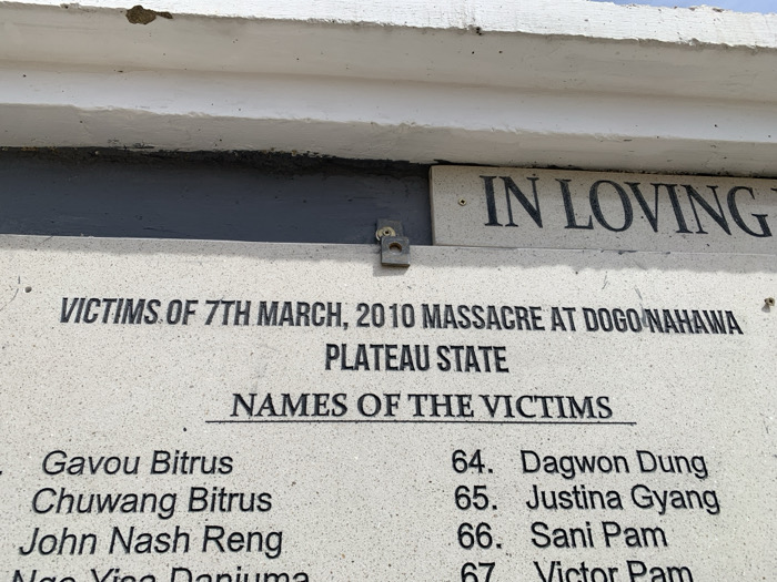 The image displays a close-up of a light-colored, granular stone memorial plaque, likely situated outdoors in the Du local government area of Plateau State, Nigeria