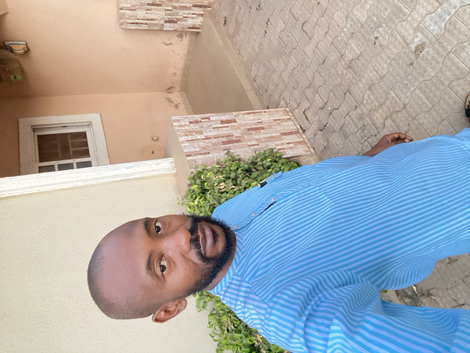 A man with a shaved head and beard is partially visible in an outdoor setting. He wears a blue striped shirt. Behind him are a building facade, a window, and landscaping with green foliage. The background also includes a textured wall and a paved area. The image appears to be a casual shot.