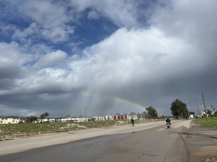 A vibrant rainbow arcs across a cloudy sky over a townscape. Below, a paved road stretches into the distance where a cyclist and a motorcyclist share the lane. Green vegetation borders the road, transitioning into residential buildings and a grassy area dotted with trash. Utility poles line the right side of the road. The sky is a mix of dark storm clouds and patches of blue.