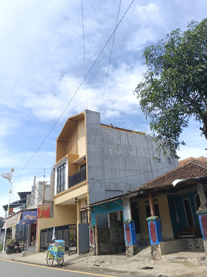 A two-story building with a beige front and gray side rises beside older structures along a street. Power lines crisscross the sky. A small cart stands near a black metal gate in front of the building. A tree with dense green foliage is to the right. The older buildings have teal accents and weathered tile roofs. A motorcycle is parked in front of a blue storefront. The sky is pale blue with scattered clouds.