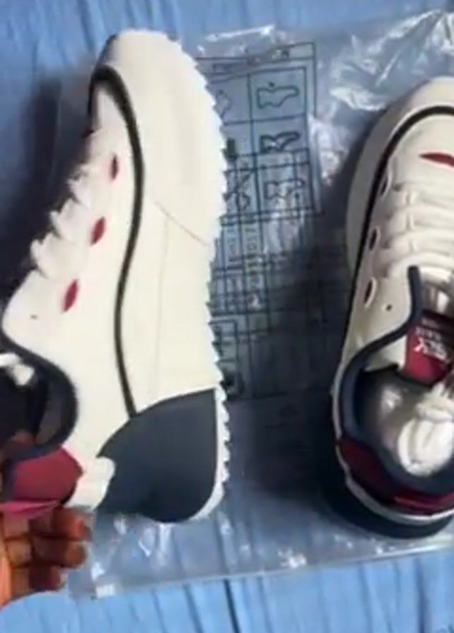 pair of new, off-white sneakers with red and navy blue accents being presented on a light blue surface, possibly a bed sheet. The sneakers are sitting on a clear plastic bag with manufacturing information printed on it. A hand with manicured nails and a ring is rotating and adjusting one of the shoes to show its different angles, including the sole, the sides, and the interior, focusing on details like the branding inside the shoe. The video appears to be a product showcase, highlighting the design and features of the sneakers.