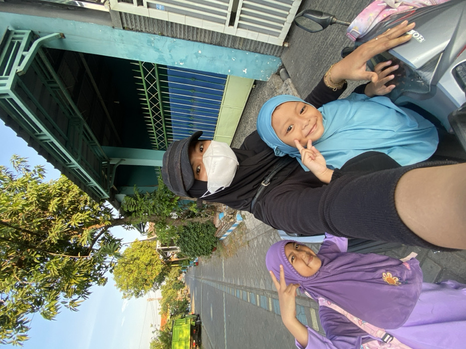 An adult female is taking a selfie with two young girls on a residential street in Sumorame, Indonesia