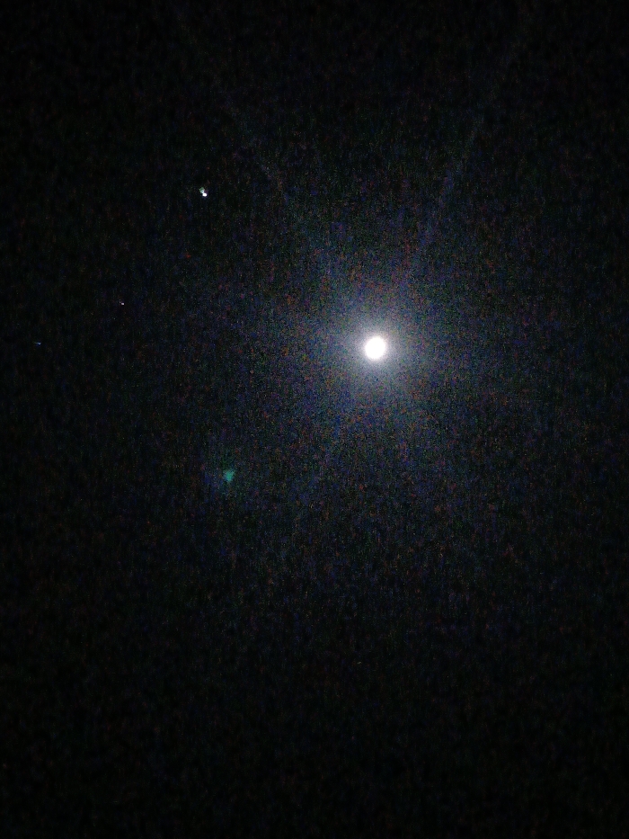 A nighttime shot displays a bright, central moon surrounded by dark sky. Dimmer stars are scattered around the moon. A faint, greenish glow appears in the lower left quadrant of the frame. The image quality is grainy, with a significant amount of noise. Overall, the scene conveys a sense of vastness and the solitude of a night sky.