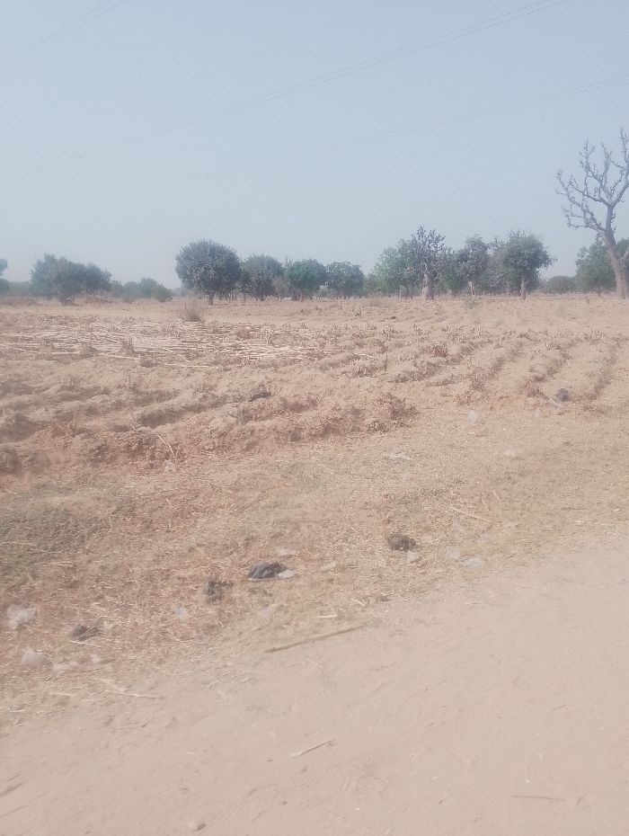 The image depicts a dry, agricultural landscape in Kanwa, Nigeria, under a hazy, pale blue-grey sky. The foreground consists of a light tan dirt path or unpaved road, transitioning into a vast, uncultivated or recently harvested field. The field's soil is dry and light brown, exhibiting faint parallel furrows and scattered remnants of light-colored crop stubble, particularly concentrated in the left-central portion. Several small, dark, irregular objects, possibly debris or animal waste, are present on the ground near the path's edge. In the midground and background, a line of trees with varied foliage density stretches across the horizon; some trees display green leaves, while others, including a prominent bare tree on the far right, appear dormant or leafless. Faint, dark horizontal lines, consistent with power lines, are visible against the upper sky. No people, active subjects, or specific interactions are observable within the frame.