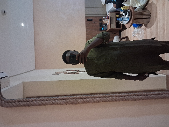 The image displays an indoor scene, likely a hotel room or private residence. A dark-skinned individual, appearing male, is centered in a full-length mirror, actively taking a selfie with a smartphone that obscures their face. The person is dressed in a dark olive-green traditional Nigerian outfit, consisting of a long-sleeved tunic (kaftan) with a placket neckline and matching trousers. The mirror itself has a thick, light brown, rope-like frame and is mounted vertically against a light beige wall. Reflected in the mirror, the room features a light-colored wooden floor and matching light beige walls. A white ceiling contains a recessed light fixture and a smoke detector, with an air conditioning vent visible in the upper left of the reflection. Room furnishings include a wooden headboard behind a partially visible bed with white linen, and a wooden bedside table. On the bedside table, a corded telephone, a lamp, and several small bottles are arranged. A round wooden table with vertical slatted legs is positioned on the floor, holding a tray with multiple clear glasses, a plastic water bottle, and other items. A light-colored upholstered chair with a wooden frame is partially visible. On the floor, a white plastic bag and a bundle of light-colored fabric are present. Abstract wall decor, appearing as wooden or metallic shapes, is visible on the wall to the left of the bed area. The specific location within Takum, Nigeria cannot be confirmed from the visual evidence in this image.