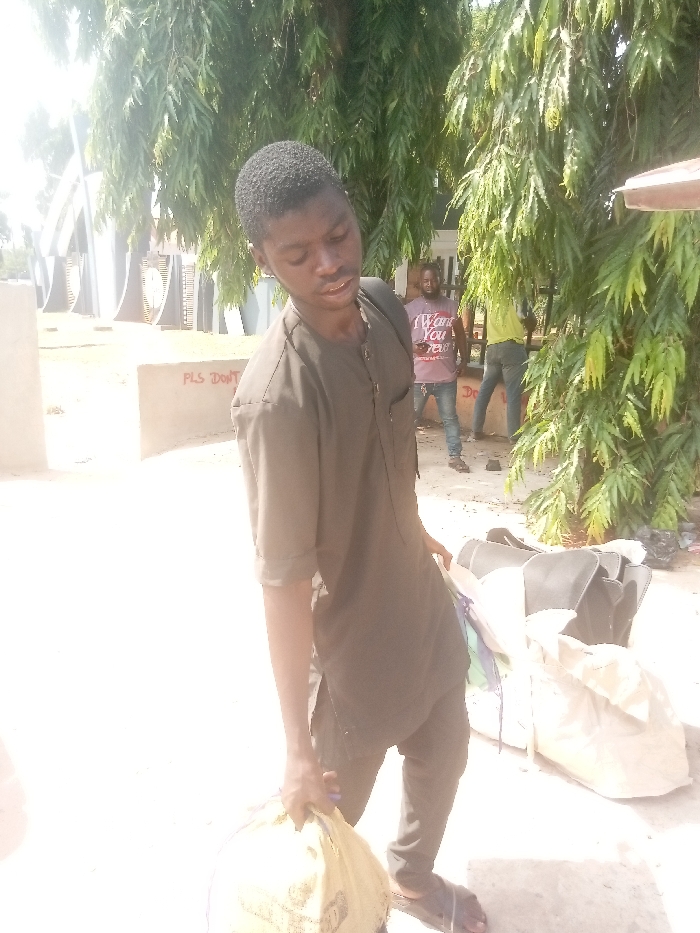 The image depicts an outdoor scene located in the city of Awka, Nigeria, under bright daylight. A young male individual, appearing to be in his late teens or early twenties, stands slightly left of center, angled towards the right foreground. He has dark skin, short dark hair, and is wearing a dark, short-sleeved traditional tunic and matching trousers, with dark open-toed sandals. His right hand is grasping a light-colored fabric sack, partially resting on the sandy ground. His gaze is directed downwards and to his right. In the mid-ground, behind the central figure and to his right, a second male is visible, wearing a light purple t-shirt with white text that reads "I WANT YOU" and blue jeans. He has a beard and stands upright, looking towards the left. Further behind him and partially obscured by foliage, a third male is present, wearing a light-colored t-shirt and blue jeans. The ground is composed of light-colored sand or dirt. To the left of the central figure, a low concrete barrier or wall displays dark graffiti reading "PLS DON'T". Beyond this barrier, in the distance, several large, dark-colored, abstract or stylized architectural structures are visible. The right side of the frame is dominated by dense green foliage from trees with long, slender leaves. Adjacent to the central figure's right, two additional large, light-colored fabric sacks, similar to the one he holds, lie on the ground. These sacks contain dark, irregularly shaped objects, with one openly displaying black, fabric-like items. A smaller, multicolored bag is situated between these two sacks. The scene is brightly lit by direct sunlight, creating strong contrasts and some overexposed areas.