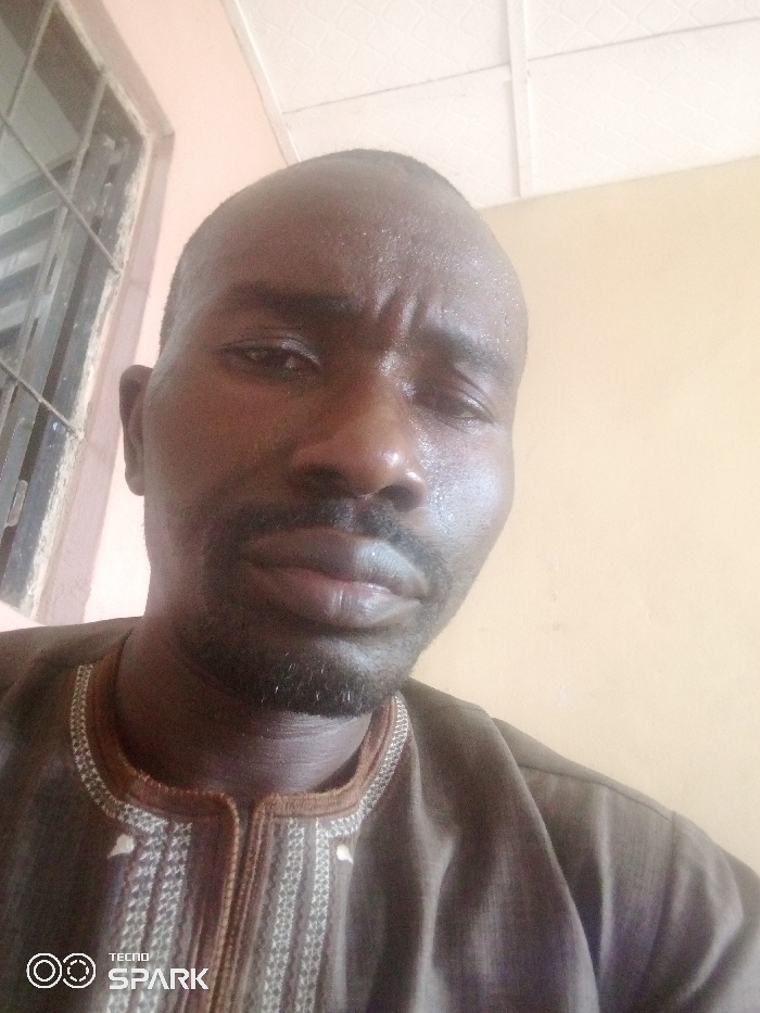 A close-up selfie of a dark-skinned man with a shaved head. He wears a brown, embroidered top. His expression is neutral. A window with metal bars is visible in the upper left corner. The wall behind him is painted a light peach color. The ceiling is white with rectangular patterns. The lower-left corner of the image features the "TECNO SPARK" logo. The man appears slightly sweaty.