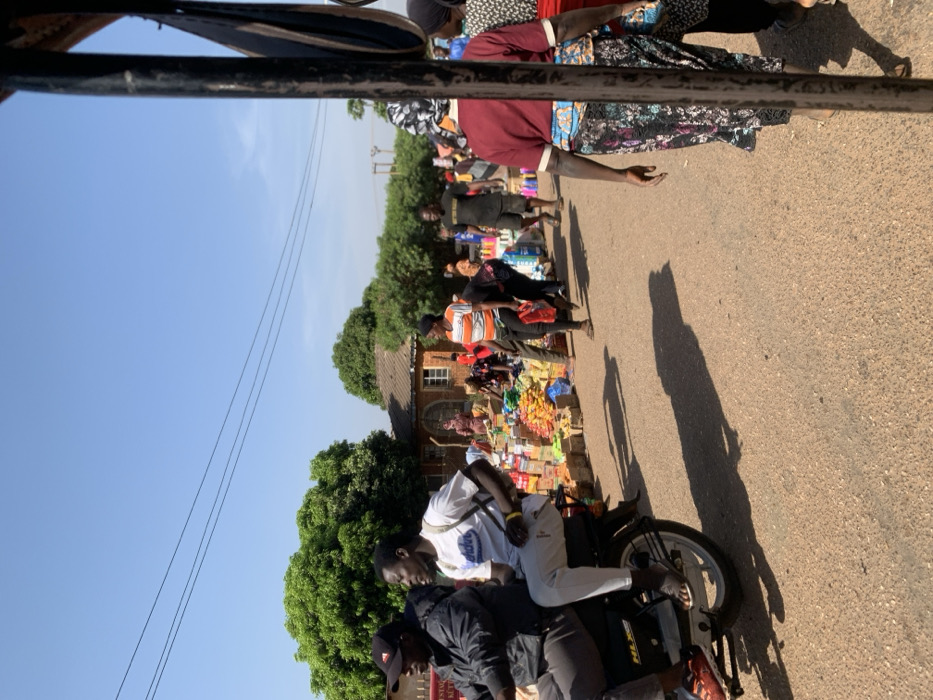 The image depicts an active street market in Kakuri Gwari, Nigeria, under a clear blue sky