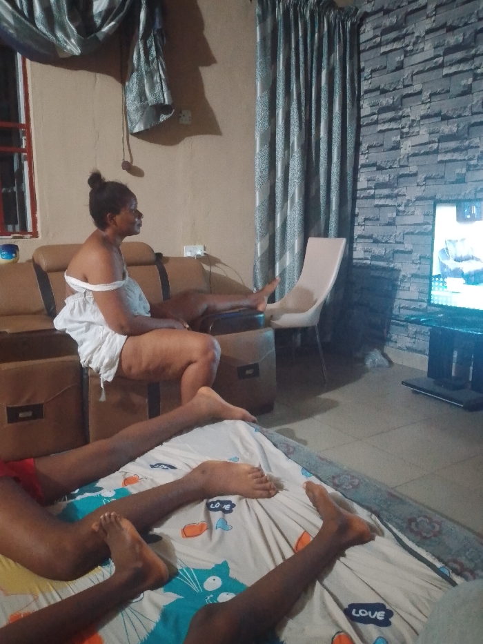 A woman in a white dress sits on a brown couch, facing a television. Her leg is propped up on a white chair. In the foreground, the legs and feet of multiple individuals lie on a bedspread patterned with cartoon cats and "love" texts. The room features striped curtains and a wall with a brick pattern. Another wall appears beige, with a window on the left side.