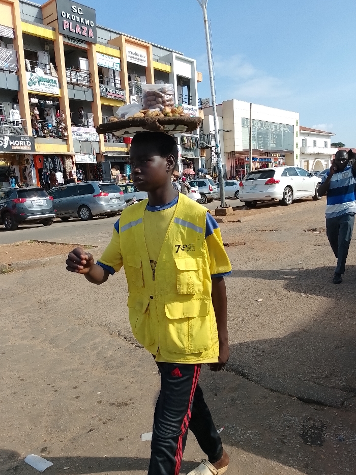 The image displays a daytime street scene in Jos, Nigeria, specifically near the SC. OKONKWO PLAZA, a multi-story commercial building visible on the left. In the foreground, a young male, with medium skin tone, walks from left to right across an asphalt road. He balances a large, dark, circular tray on his head, which holds a variety of baked goods such as buns, biscuits, and bread rolls, some contained in clear plastic bags. He is attired in a bright yellow short-sleeved shirt with blue accents, a matching yellow multi-pocketed utility vest featuring a '7UP' logo, black athletic trousers with red side stripes, and light-colored sandals. His right arm is bent with a partially clenched fist. In the mid-ground, on the right side of the road, an adult male walks from right to left, holding a mobile phone to his right ear. He wears a blue and white striped polo shirt and dark trousers. The background features the SC. OKONKWO PLAZA, a building with yellow and brown/grey facades, multiple balconies, and visible shop signs including 'GLOBAL MALL SOUVENIR' and 'DE WORLD'. Further down the street on the right, another light-colored building displays 'LONDON COSMETICS' signage. The street is populated with several parked and moving vehicles, including various SUVs and sedans. The asphalt road surface shows visible cracks and patches. An overhead streetlamp pole stands prominently on the right side of the frame. The sky is clear blue, indicating sunny conditions. Scattered white litter is visible on the ground.