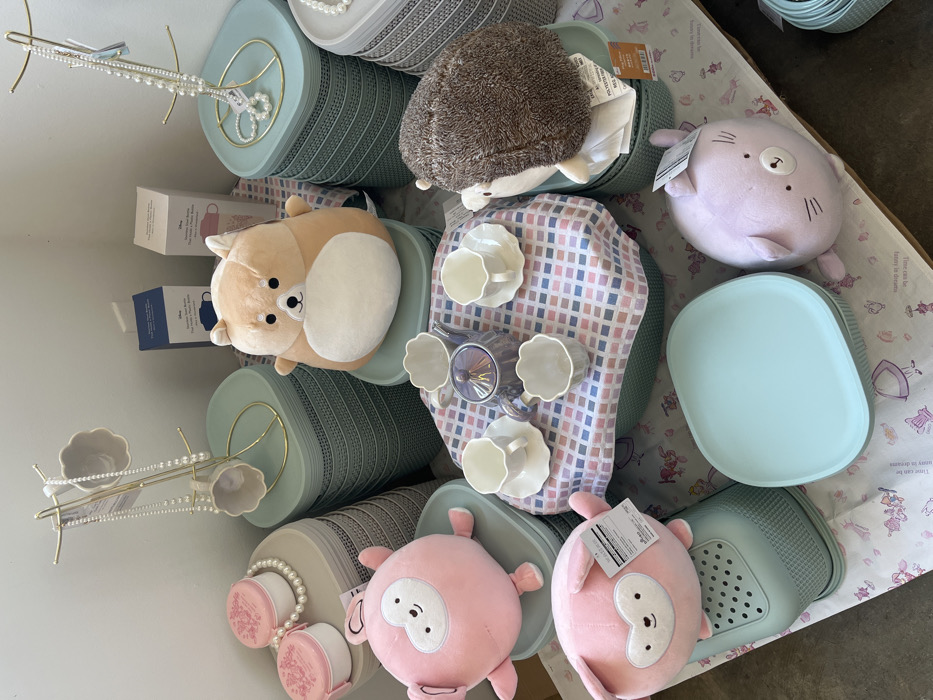 This image displays a retail merchandise arrangement in Edmond, United States. The scene is presented against a plain white wall, with merchandise resting on a light-colored floor partially covered by a white, illustrated runner. The central focus is a miniature tea set positioned on a checkered fabric (pink, blue, white, gray) laid over a light teal, ribbed storage bin. The tea set includes a glossy, iridescent purple teapot and four white, scalloped teacups with matching saucers. Surrounding this central display are various plush toys and storage containers. To the left, two round pink plush toys, resembling pig-like figures with white faces, are stacked on light teal and gray ribbed storage bins; the lower pink plush bears a product tag. A light brown, dog-like plush toy is centrally located in the upper mid-ground, seated on a stack of light teal bins. To the right, a brown hedgehog-like plush toy is positioned on additional light teal bins, also displaying a product tag. In the lower right foreground, a light purple, round plush toy resembling a cat or similar animal rests on the floor. Two gold-colored metal jewelry stands are visible, one on the left and one on the right, each draped with multiple strands of white pearl necklaces and holding small, white scalloped dishes. Further to the left, two small, pink circular containers with embossed floral lids are positioned on stacked gray bins. Several white cardboard product boxes, some with discernible "Disney" branding, are visible in the background behind the dog-like plush toy. The storage bins are consistently light teal or gray, featuring vertical ribbing, and are stacked to create varying display heights.