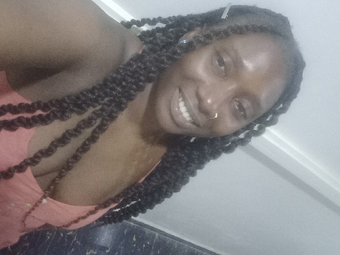 A woman with braided hair smiles at the camera