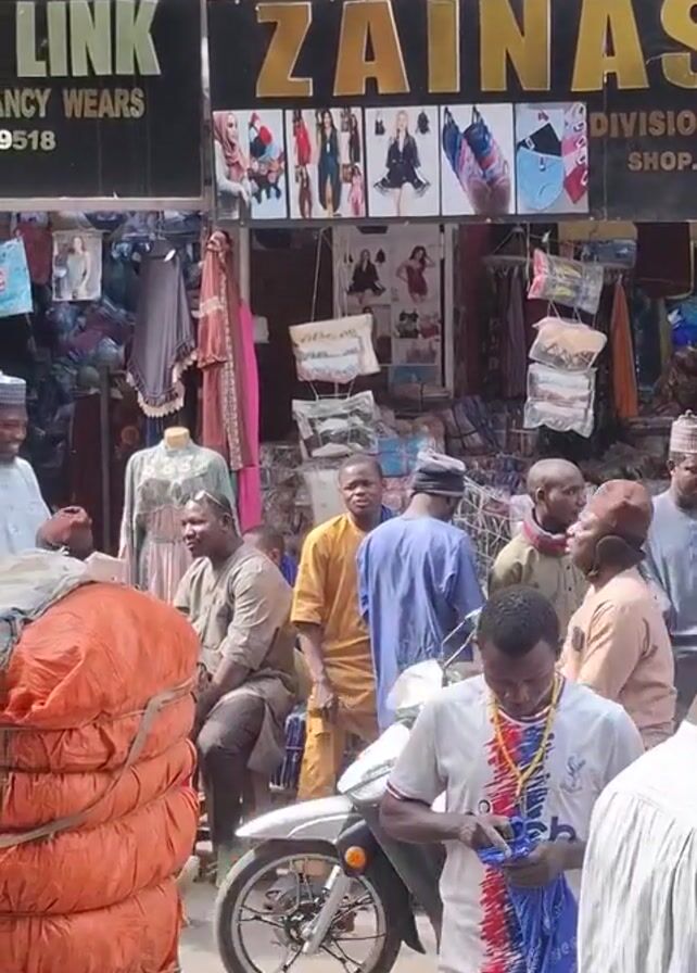 crowded street scene in front of a textile shop. The shop, named "Zainas (NDMJ) Textile Dealers," displays a variety of fabrics, clothing, and accessories. Several people are standing and interacting near the shop, some appearing to be customers examining the merchandise. A child carries a white sack on their head. Other individuals are dressed in various styles, including traditional clothing. In the foreground, there is a large stack of orange bundles, possibly containing textiles. The overall environment is busy, reflecting the commercial activity of the marketplace.