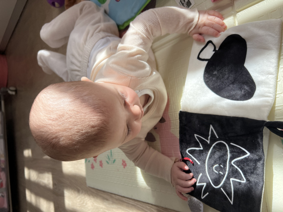 An infant, clad in light-colored ribbed long-sleeved top and matching pants over a white diaper, is positioned prone on a light-colored play mat featuring faint floral patterns. The infant's head, with sparse light hair, is angled downwards, observing a black and white fabric soft book held by their left hand. The visible page sections of the book display a white stylized sun on a black background and a black abstract shape on a white background. Parallel shadows, indicative of light filtered through window blinds, are cast across the light-colored wooden floor and the infant's head and upper back. Blurred background elements suggest other infant equipment or toys. This scene occurs indoors, within a residential setting in Ruse, Bulgaria.