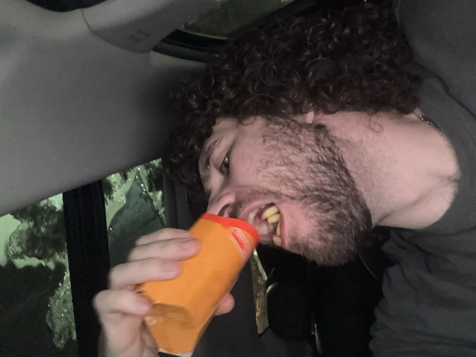 The image displays an adult male, visible from the chest up, situated inside a vehicle. He has dark, voluminous curly hair and a full beard. His right eye is visible, looking upward and to the right. The man wears a dark shirt. He holds an orange, cylindrical container with a white section or label in his right hand, positioning its opening against his widely-agape mouth. The inside of his mouth is visible, showing yellowed teeth and an orange substance at the back of his throat, indicating consumption from the container. Above him, a vehicle sunroof or panoramic roof is present, reflecting or showing a blurry, green-tinted outdoor environment with indistinct shapes, possibly foliage, suggesting the vehicle is outdoors during nighttime or low-light conditions. A gray interior pillar of the vehicle is visible on the right side. The specific location within the city of Moscow, Russia, cannot be determined from the visual information provided.