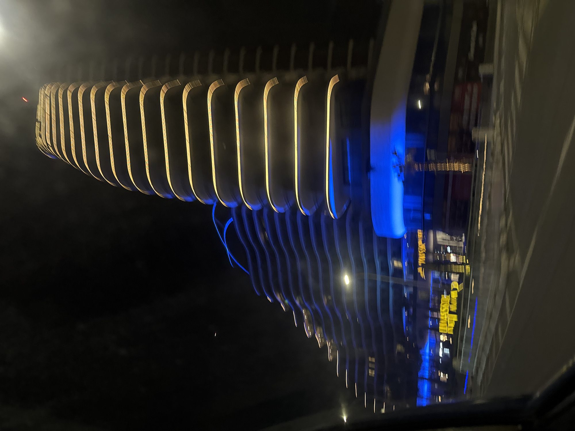 The image captures a nighttime view from a moving vehicle, depicting the Limassol Del Mar complex in Germasogeia, Limassol, Cyprus. A prominent, curvilinear skyscraper, identified as 'The Signature Collection' tower, dominates the right side, illuminated by horizontal golden-yellow light strips that highlight its undulating facade. A red obstruction light is visible at its apex. To its left, an adjacent multi-tiered building with a wave-like design is predominantly illuminated with vibrant blue lighting, particularly on its lower sections and balconies. The ground level of the buildings features additional blue illumination and blurred yellow signage, partially decipherable as "LIMASSOL DEL MAR". A multi-lane road with blurred white lane markings and a central divider occupies the immediate foreground. No discernible individuals or specific actions are visible.