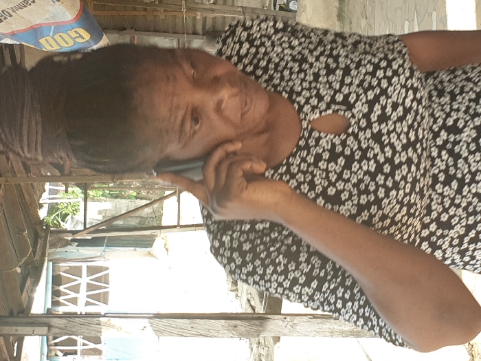 A woman in a black and white patterned dress is speaking on a smartphone, holding the device to her ear. She appears to be outdoors, with a partially visible building and wooden structures in the background. A large bag with the letters "GOD" is visible in the upper left corner. The scene is captured with a slightly awkward, angled perspective.