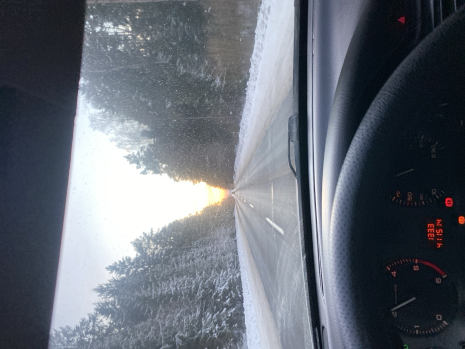 The image presents a view from inside a vehicle on a winter road in Карабоўскі сельскі Савет, Belarus. The perspective is forward through a windshield partially obscured by small particulate matter, possibly snow or ice. A two-lane asphalt road, cleared of snow in its main thoroughfare but with snow-covered shoulders, extends into the distance. It is bordered on both sides by dense conifer forests laden with snow. A low sun, characterized by an intense orange glow, is visible directly ahead on the horizon, casting strong light and a slight lens flare. The sky above is bright and hazy. In the foreground, the vehicle's dashboard is visible. A portion of a black, textured steering wheel is on the lower-left. Behind it, the instrument cluster displays a tachometer needle at approximately 1000 RPM and a speedometer needle at 0 km/h. A digital readout shows "13:33" and "411514". Several red warning lights are illuminated on the dashboard, including a circular symbol with an exclamation mark. Faint lights from distant vehicles are discernible on the road ahead, partially obscured by the sun's glare.