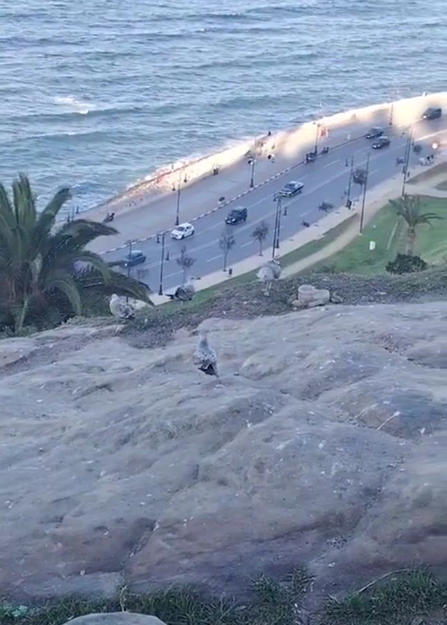 A high-angle shot shows a group of juvenile seagulls standing on a rocky outcrop with a seaside road below. The road, bordered by a grassy verge and palm trees, has several cars moving along it. The ocean is visible in the background, with small waves breaking near the shore.