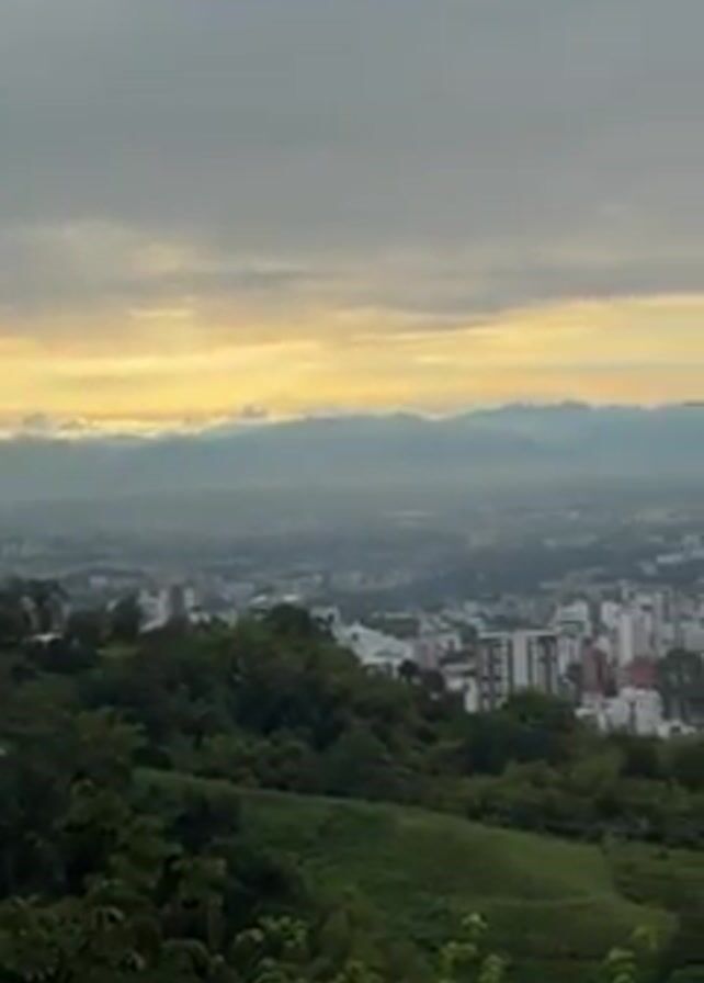 high-angle panoramic view of a city at dawn or dusk. The cityscape features numerous buildings, including high-rise structures, spread across a valley. Mountains rise in the distance, their peaks obscured by a layer of mist or haze. The sky is overcast with a mix of gray clouds and a band of golden light along the horizon. In the foreground, there is lush greenery with trees and vegetation, suggesting a hillside or elevated position overlooking the city. A bridge is visible in the middle distance, connecting different sections of the city. The overall scene has a somewhat muted color palette due to the overcast sky and atmospheric conditions.