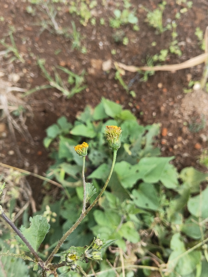 The image displays a close-up view of two developing flowers on slender stems, situated in an outdoor environment in Ngọc Tụ, Vietnam. The left flower, smaller in size, presents compact yellow florets. The right flower, larger and positioned slightly higher, exhibits yellow-orange florets partially encased by green involucral bracts. Both stems are greenish-brown and appear textured. Adjacent to and beneath the main subjects are green leaves with visible venation and minor perforations. The background consists of blurred reddish-brown soil interspersed with sparse green vegetation and dry plant debris, indicating an uncultivated ground area. No human subjects, animals, or specific actions are depicted.