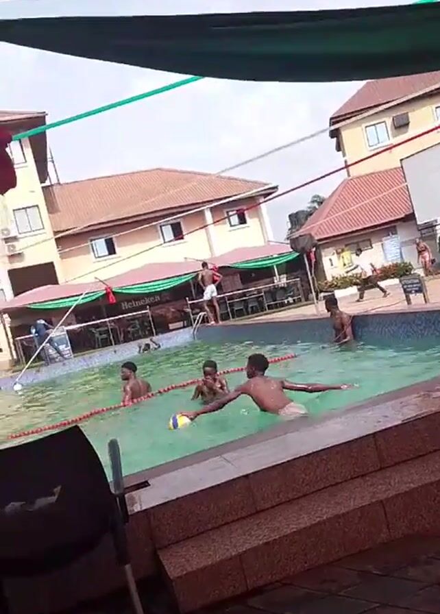 Several young people are enjoying a swimming pool at what appears to be a hotel or resort. The pool is surrounded by a tiled deck and landscaping. In the background, there are multi-story buildings with brown roofs. There's a bar area with "Heineken" signage in the distance. A few people are standing around the pool area, and some of the people in the pool are playing with a yellow volleyball. The camera is positioned under a red and green awning, partially obstructed by a chair. Overall, it's a daytime scene of leisure and recreation.