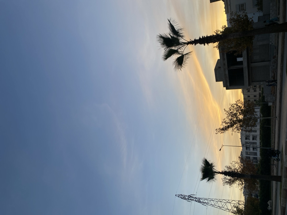 A tranquil evening scene displays a gradient sky from dark blue to golden hues. Palm trees stand tall against the fading light alongside utility poles. Buildings appear silhouetted in the distance. The image is rotated, placing the horizon along the right edge.