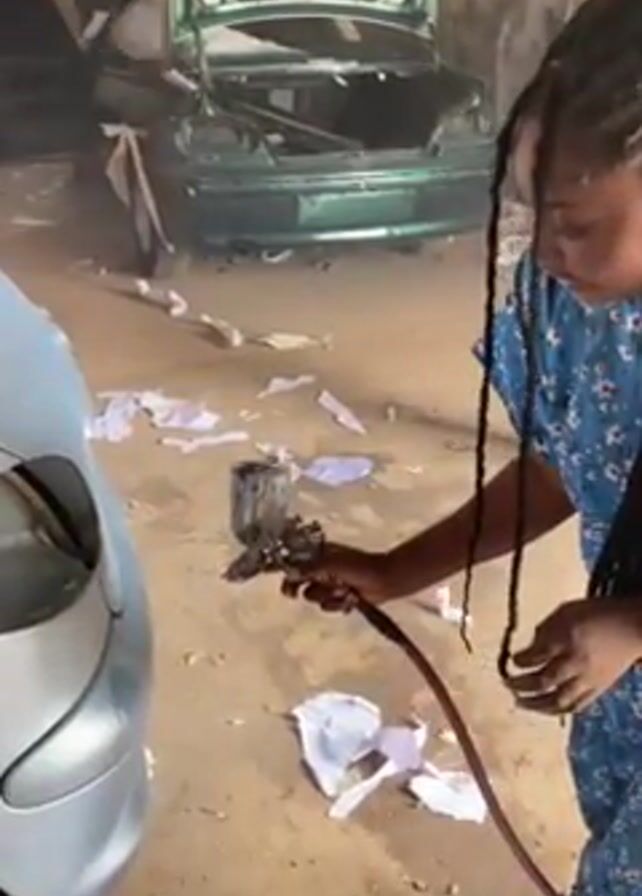 A woman is shown in a garage painting a car. She is wearing a blue dress with a floral print and has her hair in braids. She is holding a paint sprayer with a red hose attached. The car is light blue and partially obscured by the woman. In the background, there is a green car with its trunk open. There are pieces of white paper scattered on the floor. The garage appears to be dusty.