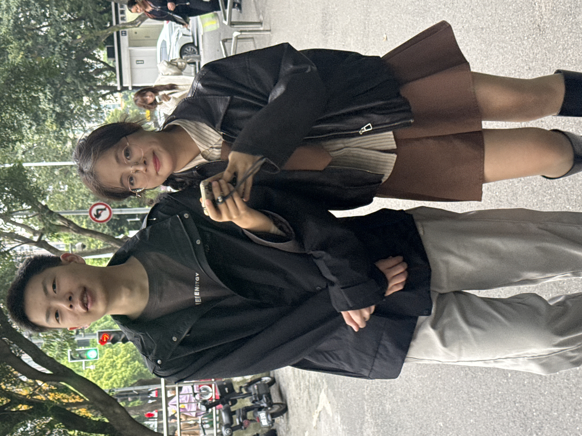 Two individuals stand on a paved street in Yuzhong District, China. The person on the left, a young Asian male, wears a dark t-shirt under a black jacket and light-colored pants. He is smiling. The person on the right, a young Asian female, wears eyeglasses, a black leather jacket, a striped shirt, and a brown skirt. She is holding a phone. In the background are trees, street signs, traffic lights, and other pedestrians. Motorbikes are also visible in the background.