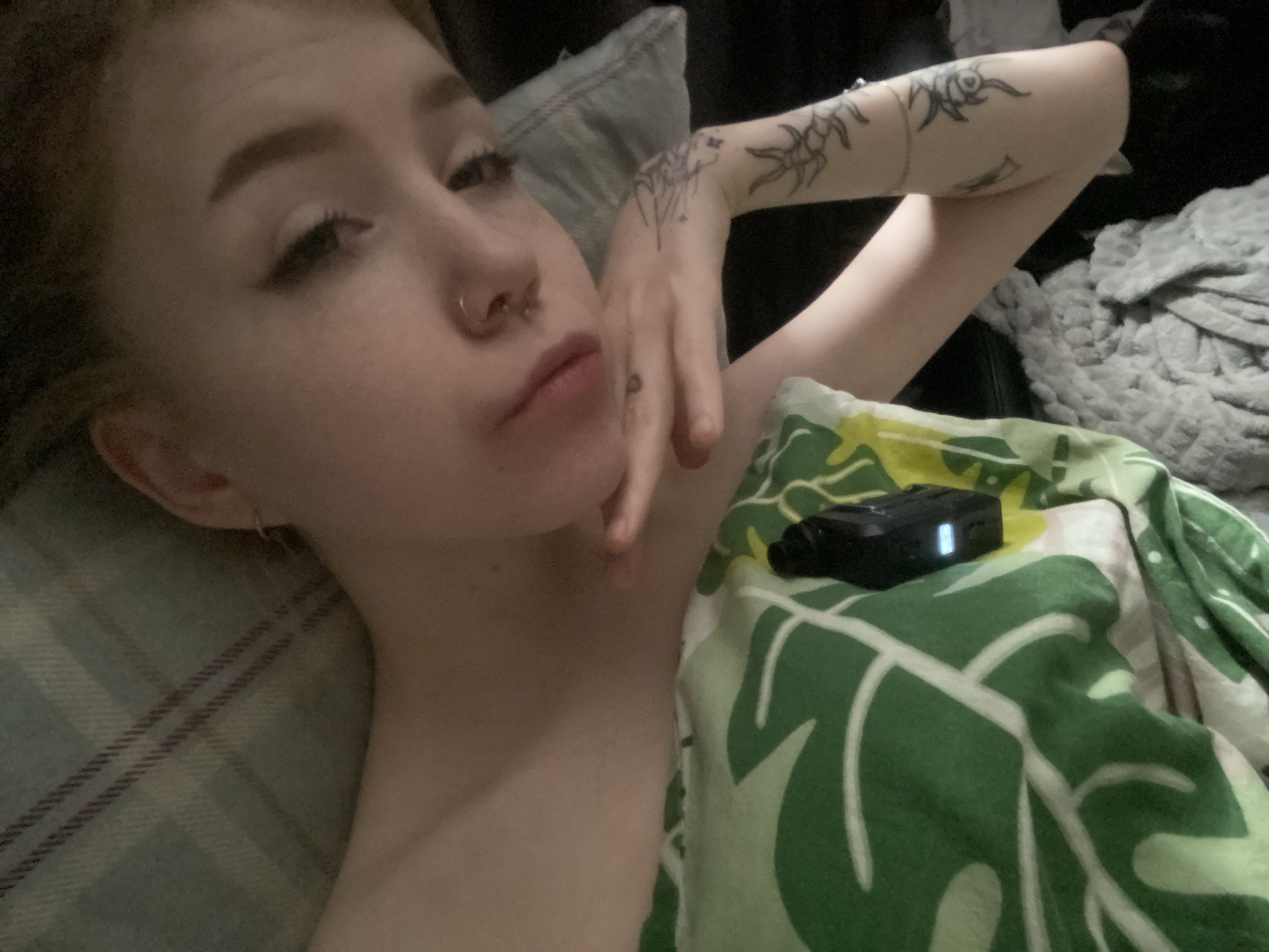 The image displays a close-up, angled view of a female individual lying in an indoor, dimly lit domestic setting, likely a bed or sofa. The individual, positioned with her head to the left of the frame, has light-colored hair and wears dark eyeliner. Her visible facial piercings include a ring in her left nostril and a barbell in her septum. Her right hand, adorned with a small dark tattoo on the index finger, is raised to her face, with fingers resting near her chin. The individual's left arm, also visible, exhibits multiple dark-inked tattoos, including designs on the forearm and bicep area that appear abstract or skeletal. The upper torso of the individual is partially covered by a green blanket featuring a distinct white monstera leaf pattern. Resting on this blanket, near her right shoulder, is a small, black electronic device, possibly a body camera or recorder, displaying a blue illuminated screen. Behind the individual's head, a textile with a light-colored plaid or striped pattern is visible, likely a pillow or blanket. To the right of the frame, a textured, grey-colored fabric or blanket is present. The specific location within Izhevsk, Russia, cannot be determined from the visual information provided in the image.