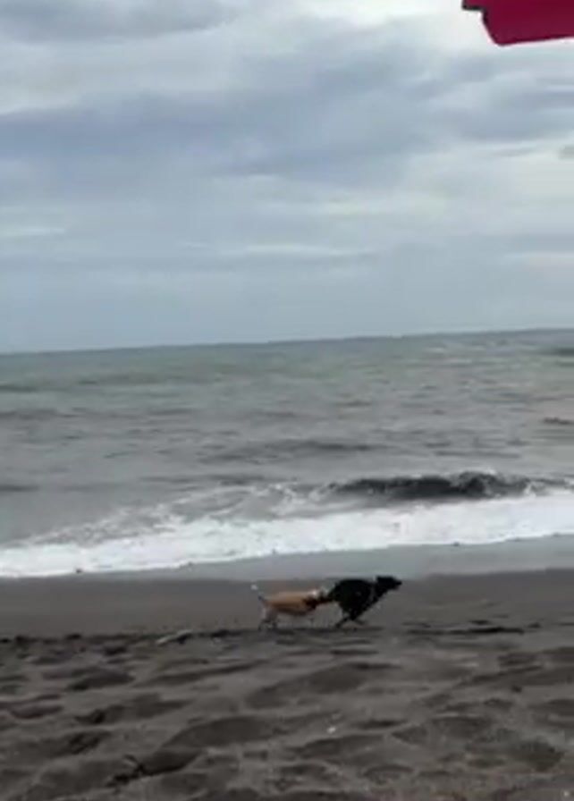 beach scene with two dogs playing on the black sand. A red flag flutters in the wind beside a small wooden table set with a drink and a dish. Someone is relaxing on the sand beneath the table. The ocean waves are visible in the background under a cloudy sky.