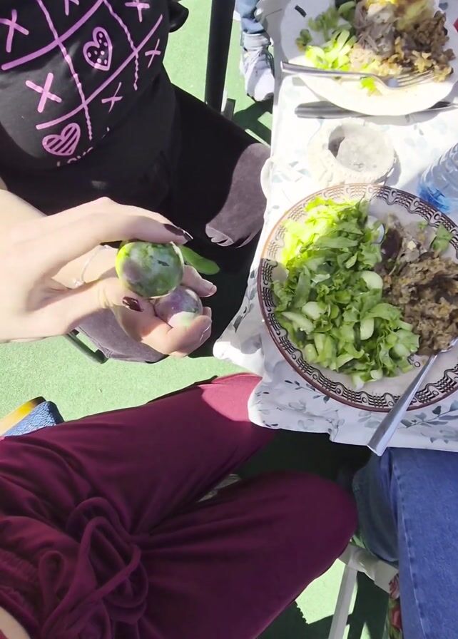 group of people sitting around a table outdoors, likely during a meal or gathering. One person, wearing maroon pants, holds two Easter eggs, one green and one purple, in their hands, turning them over. Other individuals are seated at the table, with plates of food visible. One person is wearing a black shirt with a pink tic-tac-toe design. The table is covered with a tablecloth and has plates of food on it, including salad and some type of casserole. It appears to be a sunny day, and the setting is likely a backyard or patio, as green artificial turf is visible. The people are interacting, possibly playing a game with the Easter eggs.
