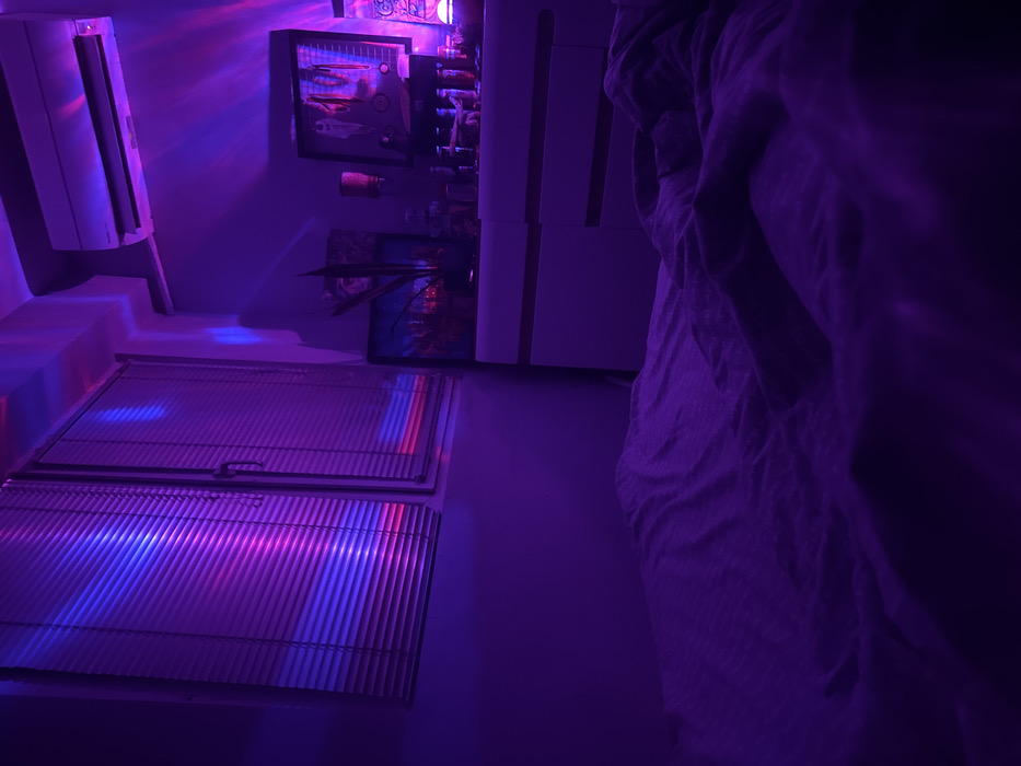 The image displays an indoor room in Novi Pazar, Bulgaria, characterized by strong purple and blue ambient lighting