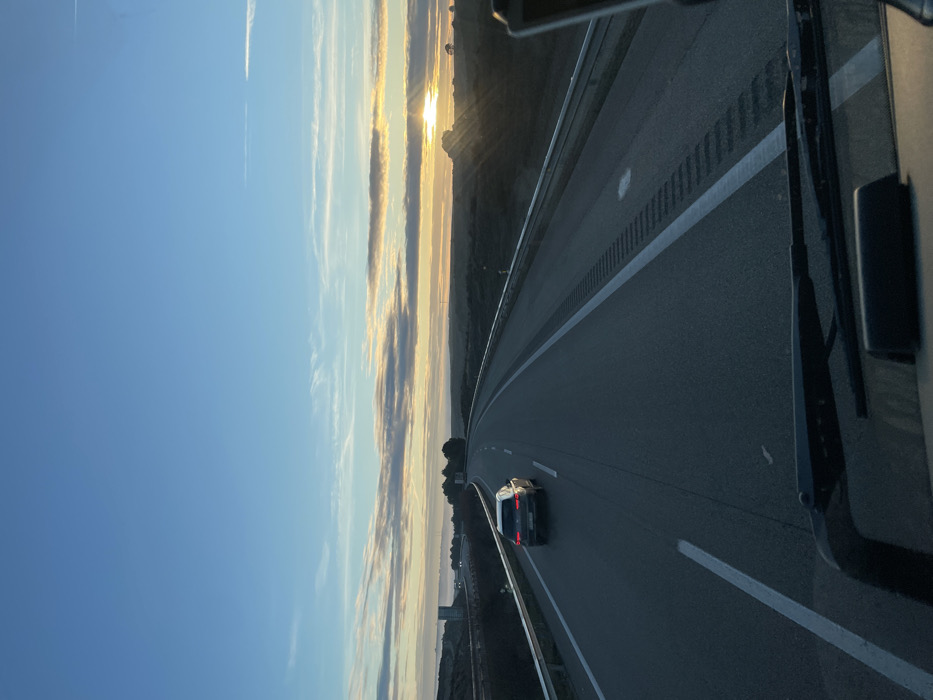 A highway stretches into the distance under a vibrant sky. The sun, a source of light, is positioned above a landscape obscured by clouds. A car travels along the highway, tail lights visible. The road is marked with white lines and a textured safety strip. The angle suggests a view from inside a vehicle, with part of the dashboard and windshield wiper visible on the right.