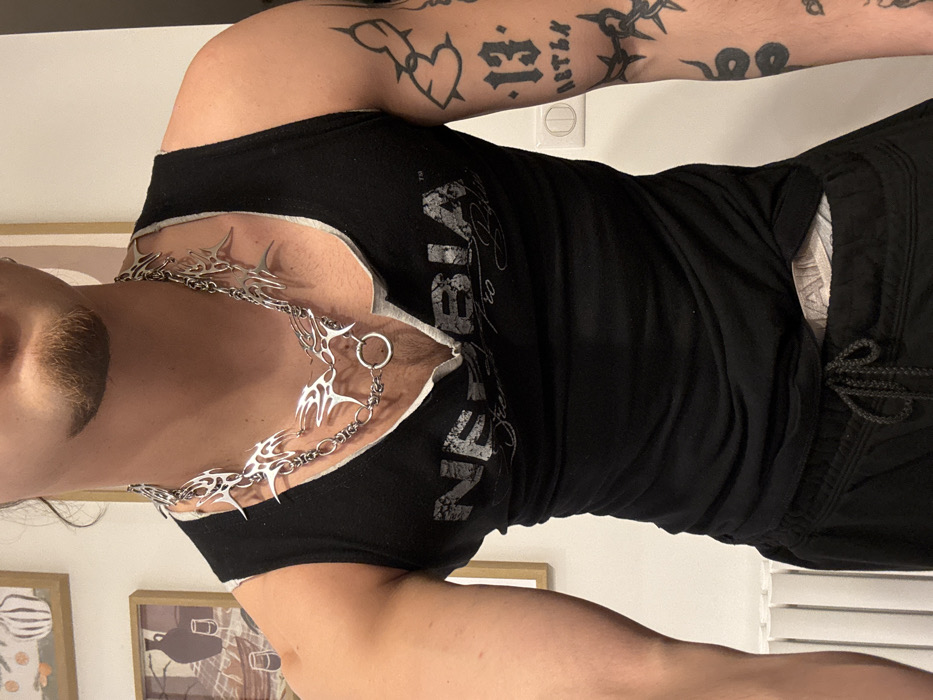 An individual, identified as male, is depicted from the upper chest to mid-thigh, standing indoors in what appears to be a residential setting within Asnières-sur-Seine, France. The subject has fair skin, visible musculature, and a dark goatee. Long, dark hair is partially visible on the left side of the head. The individual wears a black sleeveless tank top with a distressed white graphic print on the chest, partially legible as "NEBBIA Strength Pro Performance." A white undershirt is visible beneath the tank top's open neckline. Around the neck is a multi-layered, silver-toned necklace composed of chains and abstract, flame-like or tribal spike elements, featuring a central ring. Black sweatpants with a visible tied drawstring are worn on the lower body. The white waistband of underwear is partially exposed above the sweatpants on the right side. The left arm displays multiple black-ink tattoos, including abstract barbed wire or thorn patterns on the upper arm and forearm. The forearm also features the number "13" in a gothic font, followed by Cyrillic text, and a stylized serpent or similar pattern. The background consists of light-colored walls. On the left wall, two framed artworks are visible: an upper piece depicting abstract orange and yellow shapes, and a lower piece showing two dark vessels and two wine glasses. A white horizontal panel radiator is partially visible on the lower left. A white electrical outlet or light switch with two circular controls is present on the right wall. The individual is stationary, posing for the photograph.