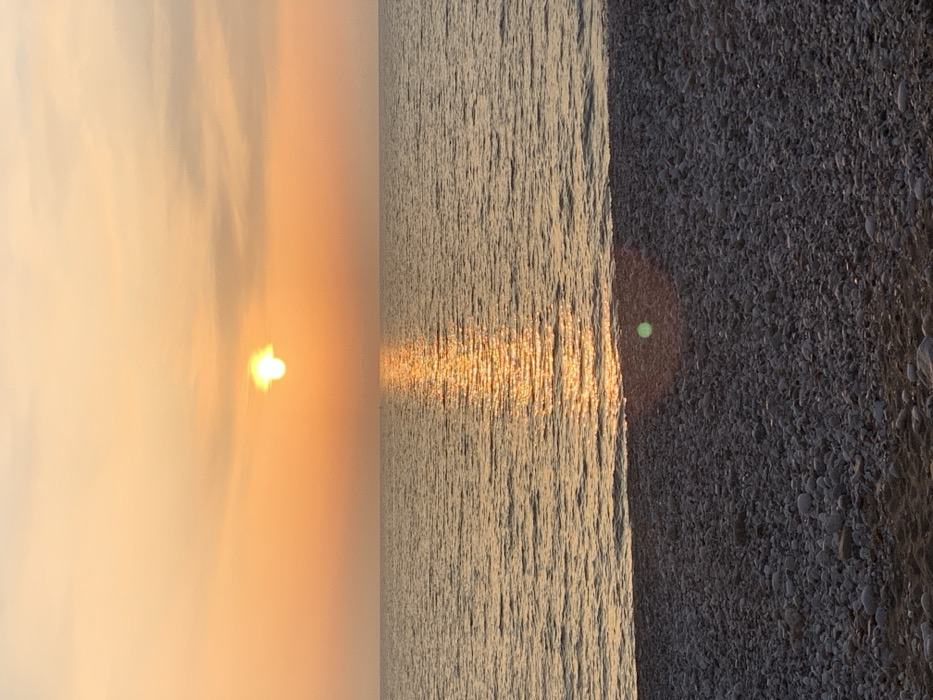 The image displays a coastal sunset scene over the Adriatic Sea, viewed from a pebble beach in the city of Bar, Montenegro. The sun, a prominent bright yellow-orange orb, is situated in the upper-center of the frame, casting a shimmering vertical reflection of golden light across the calm water surface. The sky exhibits gradients of orange and yellow hues, transitioning to lighter tones towards the upper edges, with minimal cloud cover. The foreground consists of a dry pebble beach, characterized by numerous small to medium-sized grey and white stones. A distinct green circular lens flare is visible on the beach surface, slightly right of the frame's vertical center. No human figures, objects, or structures are present in the observable environment.