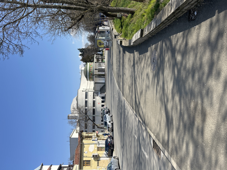 The image presents a daytime urban street scene in Yambol, Bulgaria. The foreground shows a grey asphalt sidewalk extending from the bottom-left to the center-right, displaying numerous dappled shadows from unseen overhead tree branches. A metal manhole cover is visible on the sidewalk. To the right, a multi-tiered stone retaining wall borders a sloped grassy bank with several bare deciduous trees. Adjacent to the sidewalk on the left is a two-lane asphalt road marked with white dashed lines and featuring a rectangular storm drain grate near the curb. Multiple vehicles are parked along the left side of the road: a light-colored sedan, a dark sedan, a silver SUV, and additional indistinct dark vehicles. A single individual, dressed in blue, is visible near the rear passenger side of the dark sedan. In the midground, an aged two-story yellow building with multiple windows and visible exterior utility lines stands on the left. Adjacent to it is a large, multi-story modern white building characterized by a curved facade, horizontal window bands, and a flat roofline. In front of this structure, a smaller, circular single-story building with a green-patterned domed roof and white columns is situated at an intersection. Further right, a transparent glass and metal bus stop shelter displays an advertisement for "Betano" featuring a male figure in a white jersey. Several indistinct human figures are visible near the bus stop shelter. The background consists of additional bare trees and a clear, bright blue sky, indicating fair weather conditions.