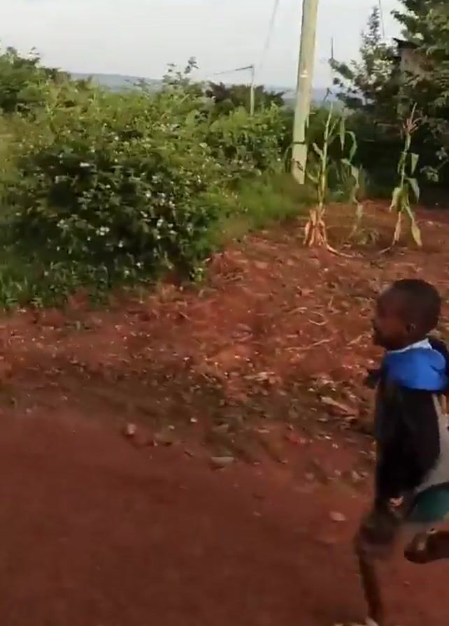 A young boy is running down a red dirt road. He is wearing a blue and gray jacket, shorts, and white sneakers. He is carrying something on his back. The environment includes green vegetation, including corn stalks and trees, and a building in the background. The sky is overcast. The camera seems to be moving along the road following the boy.