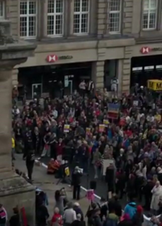 A crowd of people stand in front of a building. The crowd is gathered in a city square. The building behind the crowd has "HSBC" signage on the front. Many people in the crowd are holding signs and banners. There are people on a makeshift stage with microphones addressing the crowd. There are cameras in the crowd. The overall tone of the scene suggests a protest or rally.