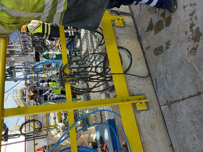 The image depicts an industrial outdoor work environment located in Maasvlakte Rotterdam, Netherlands. The foreground shows a concrete ground surface with scattered dark stains and visible footprints. A bright yellow metal handrail system, comprising vertical posts and horizontal rails, is bolted into a concrete barrier wall that separates the foreground from an elevated work area. Dark coiled cables are suspended from the yellow handrail. Blue hoses are also visible near the lower left of the frame. Behind the yellow barrier, several individuals are present on a metal grating platform, engaged in industrial tasks. One worker in the mid-left wears a dark blue jacket, high-visibility yellow pants, and a yellow hard hat, leaning forward to work on equipment. Another worker, positioned further right, wears dark clothing with yellow high-visibility stripes and a yellow hard hat. Additional workers are partially visible in the background. The area behind the workers features various industrial components, including pipes, valves, gauges, and an upright light blue gas cylinder. Numerous black electrical cables are routed throughout the equipment structures. In the distant background, large white industrial tanks or buildings, further yellow structures, and a white vehicle are visible under a light blue sky. A person wearing a high-visibility yellow and dark-colored jacket is partially visible on the far right, with their right arm raised.