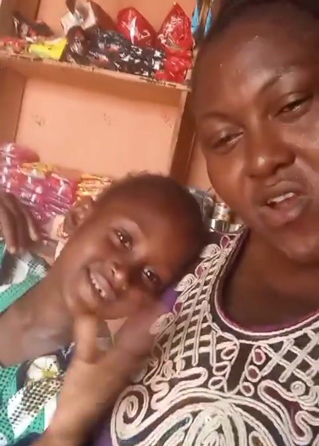 A woman in a purple shirt with white embroidery holds a young child with short hair against her chest. The child is wearing a green and blue patterned shirt. They are indoors, likely in a store, as there are shelves filled with various items behind them. The woman is speaking to the camera.