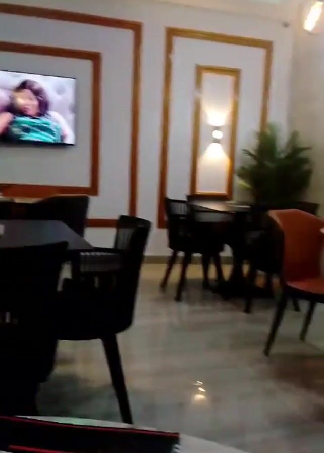 interior of a restaurant. The walls are white with brown trim, and there is green lighting along the ceiling. There are multiple tables with a mix of black and orange chairs. Some tables are round and white, while others are rectangular and black. A television is mounted on the wall, and there is an abstract painting on another wall. The floor is tiled. A menu with a QR code is visible in the foreground.