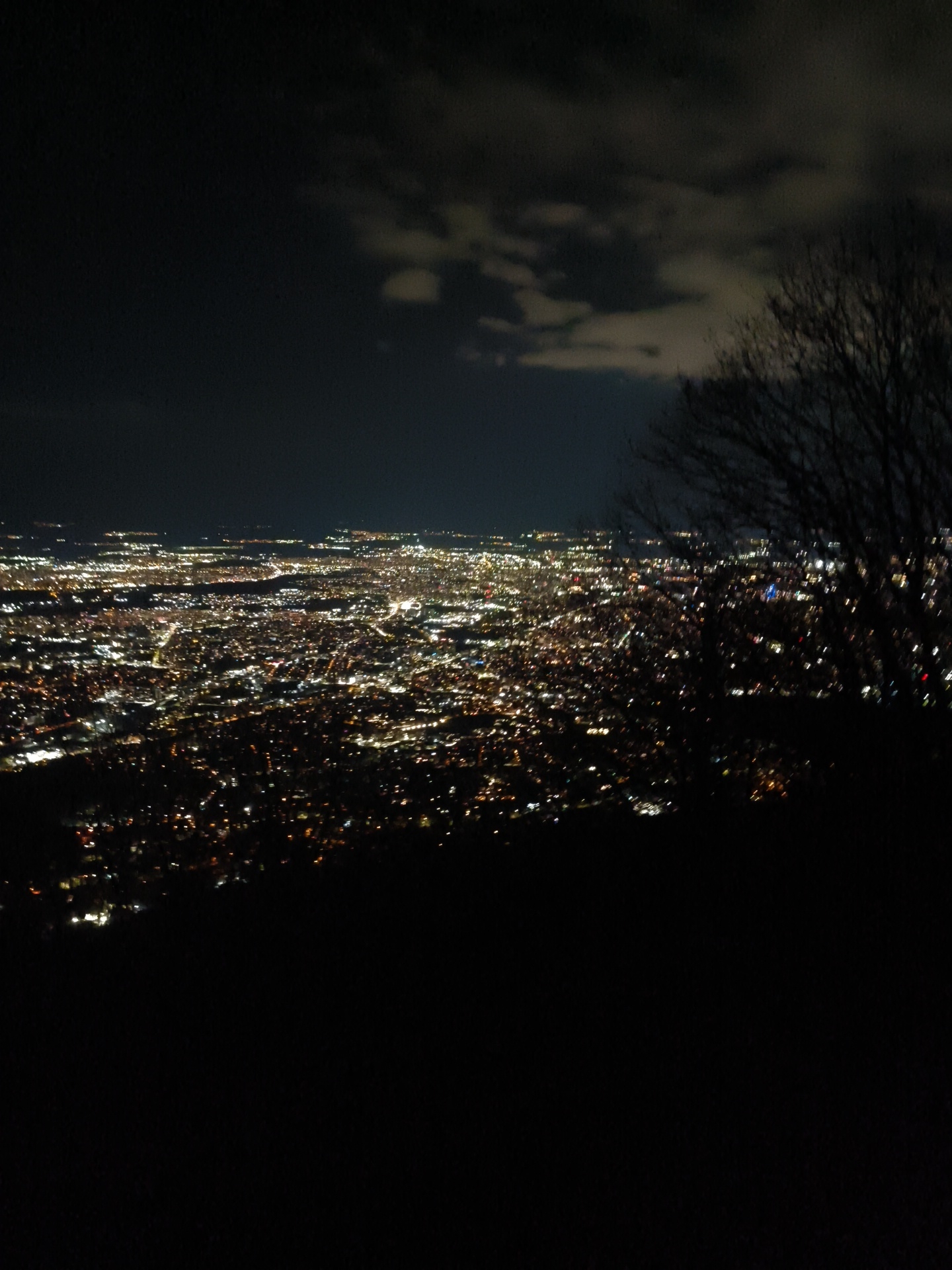 A nighttime cityscape with city lights extending to the horizon. Dark clouds are present in the upper portion of the frame, and the silhouette of a bare tree is visible on the right. The bottom portion of the image is in shadow. The scene shows a view of the city of Sofia, Bulgaria at night.