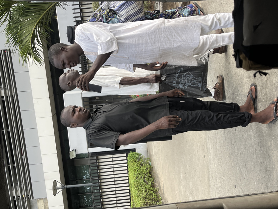 An outdoor scene in Itirin, Nigeria, depicts four individuals standing on a paved surface in daylight, against the backdrop of a modern building with a grey paneled facade, horizontal louvers, and large windows