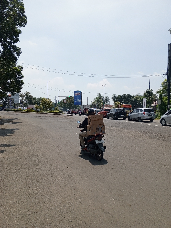 An individual is operating a dark-colored scooter, observed from the rear, on a wide asphalt road in Multhan, India. The rider wears a dark jacket, light trousers, and a helmet. Two brown cardboard boxes, labeled "YOGA" on the upper box, are stacked and secured to the rear cargo area of the scooter. The scooter is positioned towards the right side of the road, proceeding into a multi-lane intersection. In the middle distance, a queue of various vehicles including motorcycles, cars (silver SUV, dark SUV, orange sedan), and a truck is visible. Green traffic signals are active at the intersection. Power lines traverse the sky, which is clear and light blue. A large blue billboard displaying "PAJAU" and phone numbers is present in the background. Lush green trees line the roadsides and a central median. The scene is illuminated by bright daylight, casting visible shadows.