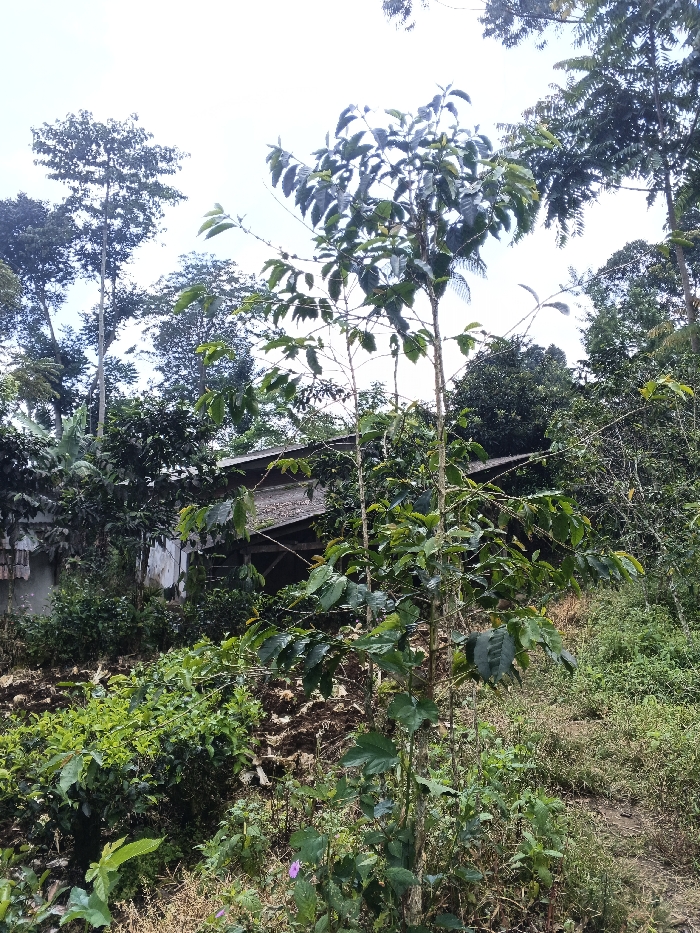 A vibrant landscape features lush greenery with trees of varying heights and foliage density. A small, partly obscured structure with a slanted roof nestles amidst the dense vegetation. In the foreground, a young tree stands prominently, its green leaves contrasting with the surrounding undergrowth. The scene evokes a sense of natural abundance and rural tranquility.