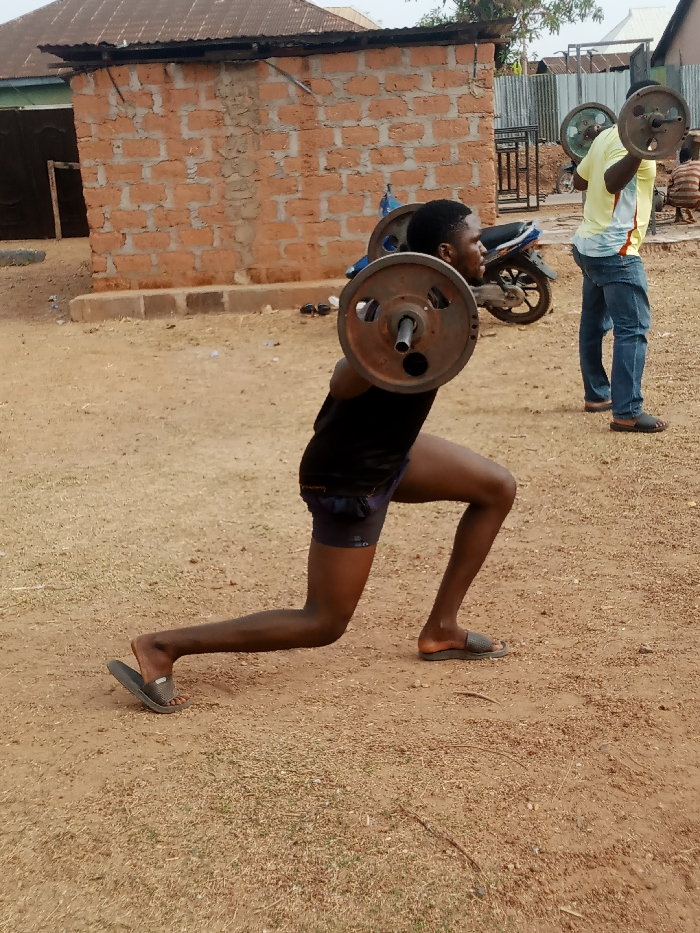Two men are exercising outdoors. One man in the foreground is wearing a black tank top and dark shorts, doing a weighted lunge with a barbell across his shoulders. He is also wearing sandals. Another man is standing in the background holding a barbell over his head. He is wearing a yellow shirt, blue jeans, and sandals. A brick building with a metal roof is in the background, along with a motorcycle and other outdoor equipment. They are all on a sandy, dirt surface.
