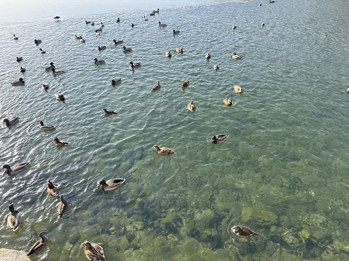 A large body of water, possibly a lake or pond, is filled with numerous ducks. The water is clear enough to see rocks on the bottom in certain areas. The ducks are varied in color, from brown and black to having green heads. They are scattered across the water, some clustered in groups and others swimming alone. The water's surface has ripples, indicating movement.